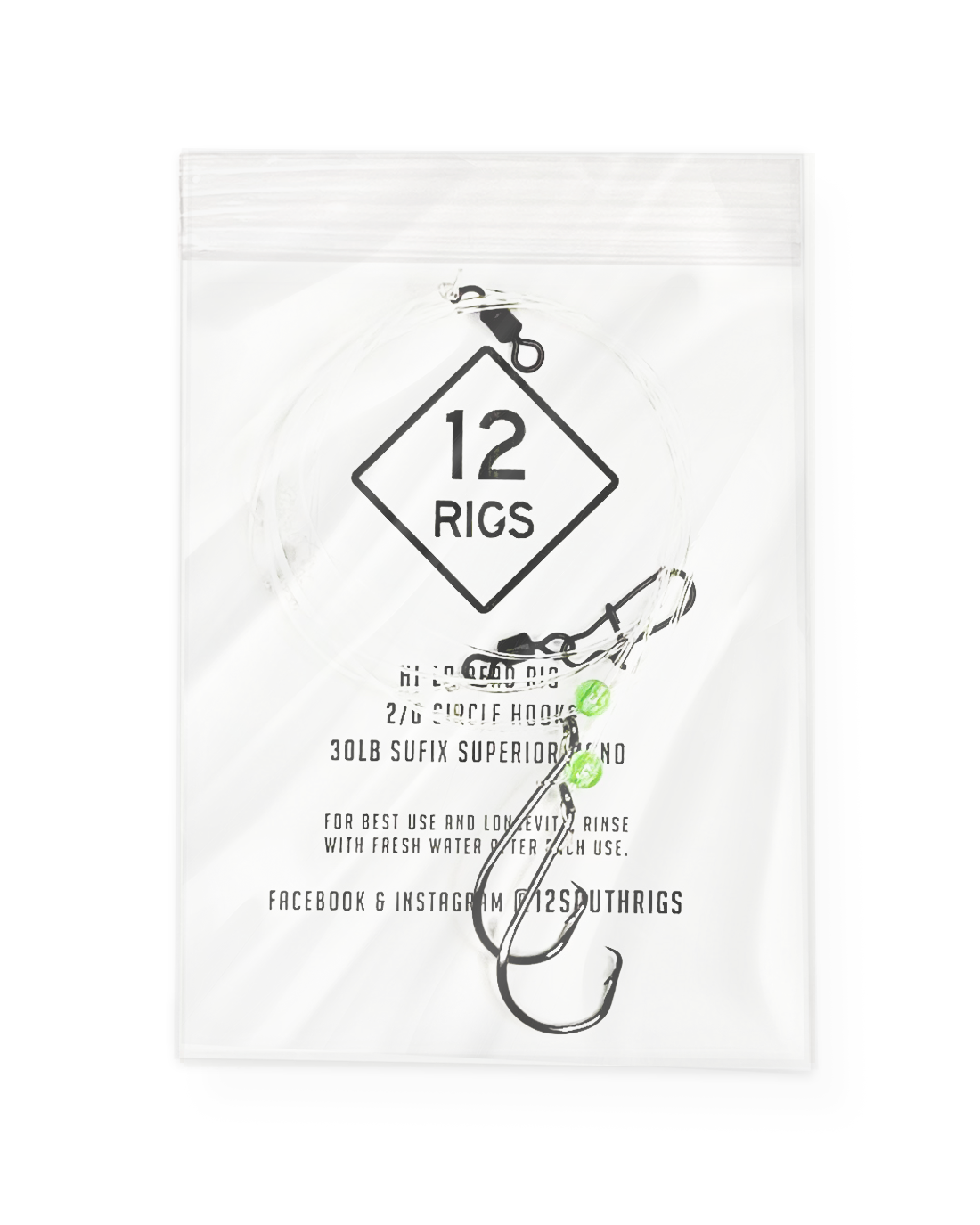 Made with 30LB Sufix Superior Mono and 2/0 circle hooks. Can also be customized with your choice of line and hook size upon request.